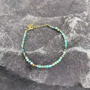 Produktbeschreibung (DE) Dieses feine Turquoise Gold Armband vereint minimalistisches Design mit eleganter Natürlichkeit. Die 3 mm facettierten Naturstein-Perlen in African Turquoise Optik verleihen dem Armband eine dezente, aber dennoch ausdrucksstarke Ausstrahlung. Die kleinen, geometrischen Edelstahl-Elemente in goldfarbener Veredelung setzen edle Akzente und sorgen für einen modernen, luxuriösen Touch. Durch das filigrane Design eignet sich das…