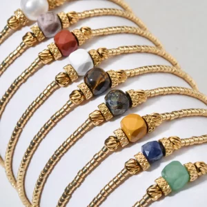 12,99 €Produktbeschreibung (DE) Dieses filigrane Boho Gold Armband vereint minimalistisches Design mit luxuriöser Ausstrahlung. Die feinen, facettierten Naturstein-Elemente in Kombination mit der vergoldeten Edelstahlkette verleihen dem Armband eine elegante und zugleich verspielte Note. Die zarten, quadratischen Steinperlen sorgen für einen modernen, strukturierten Look, während das handgefertigte Design die hochwertige Verarbeitung unterstreicht. Durch die verstellbare Länge passt…