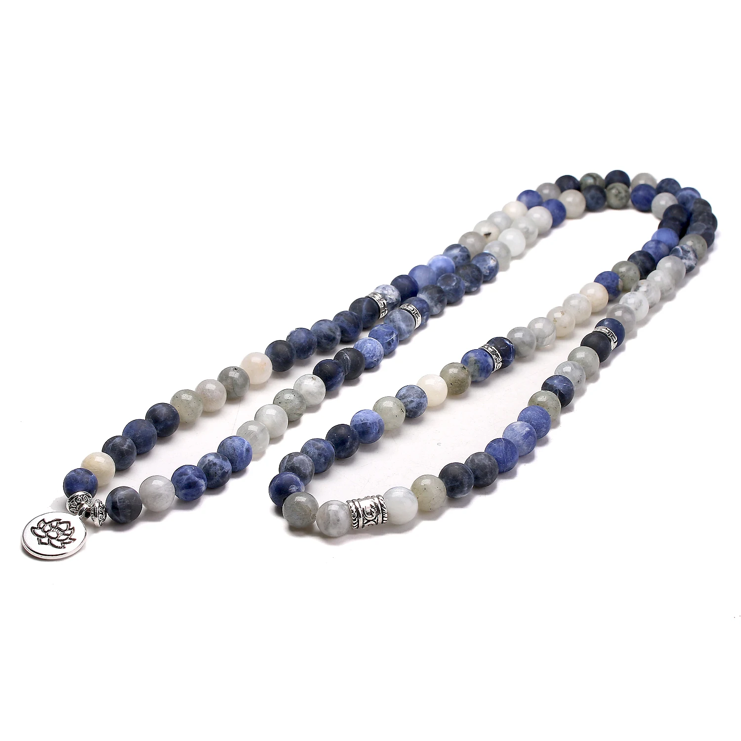 108 Mala Armband/Halskette – Mondstein & Sodalith Naturstein | Lotus-Anhänger