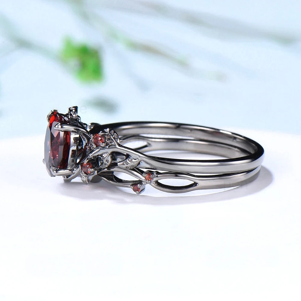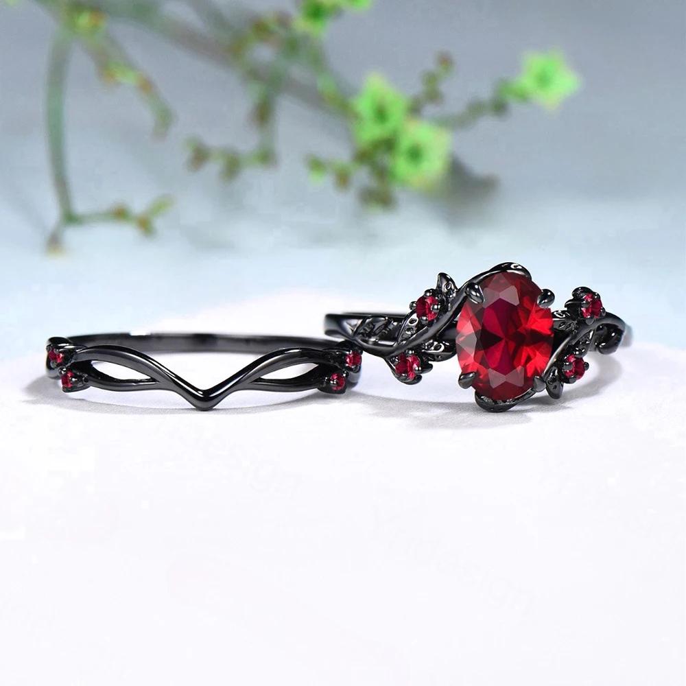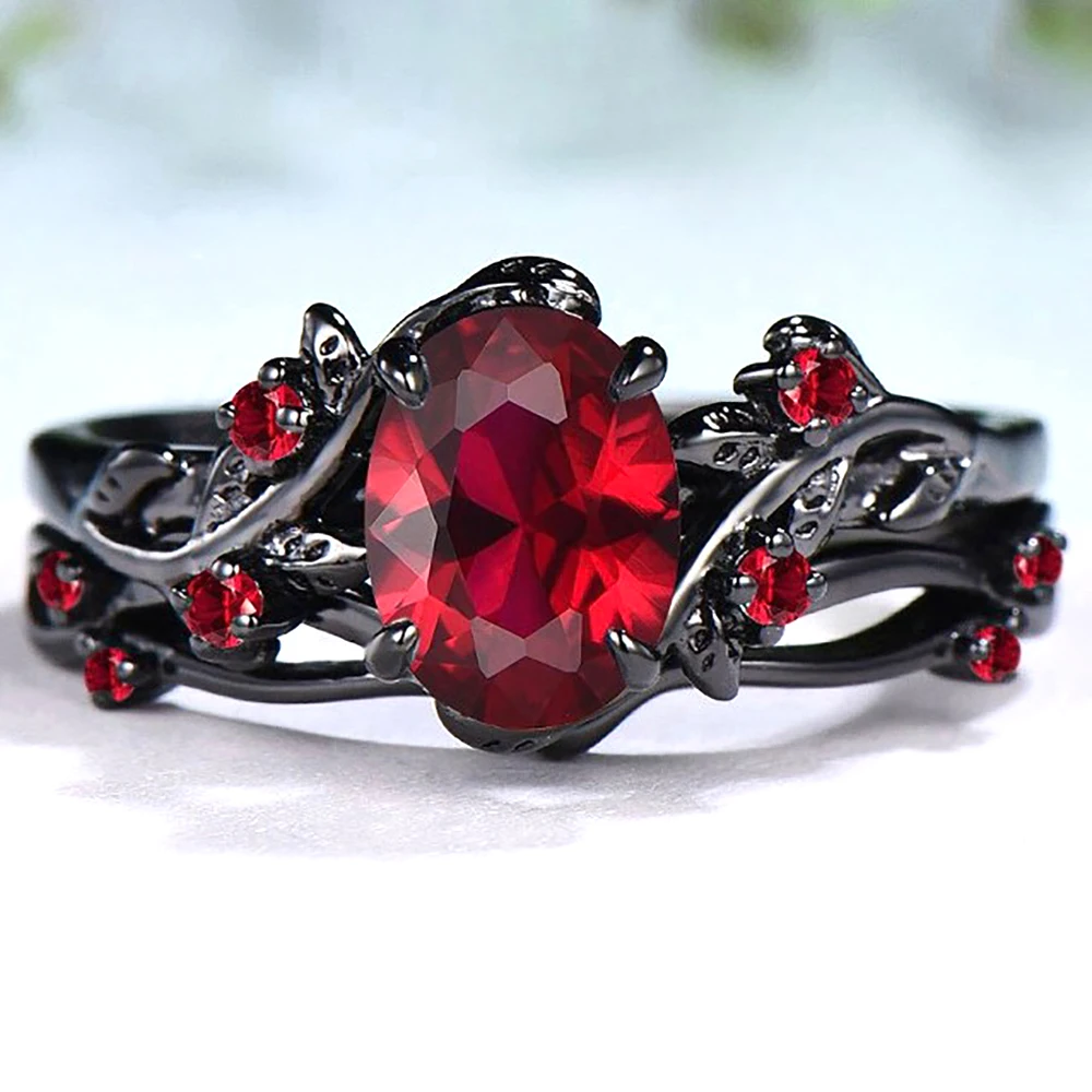 2er Set Damenringe in Gun Black mit Rotem Zirkonia