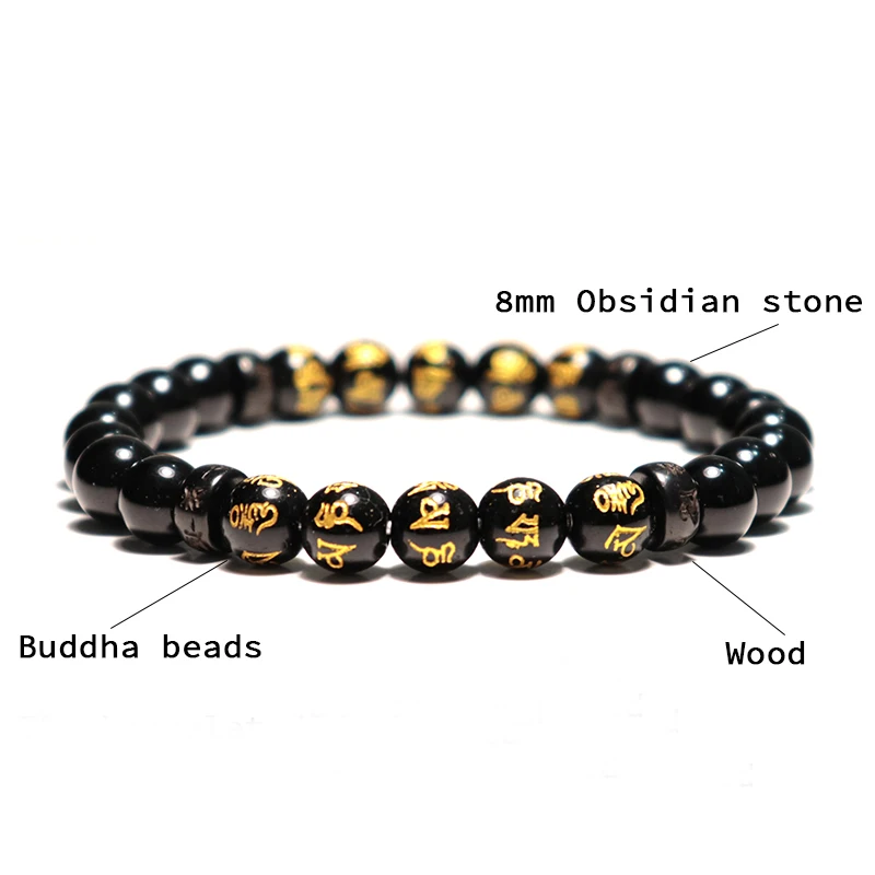 Made of 8 mm obsidian beads, each bracelet is engraved with the powerful Buddhist mantra “Om Mani Padme Hum” in golden script.