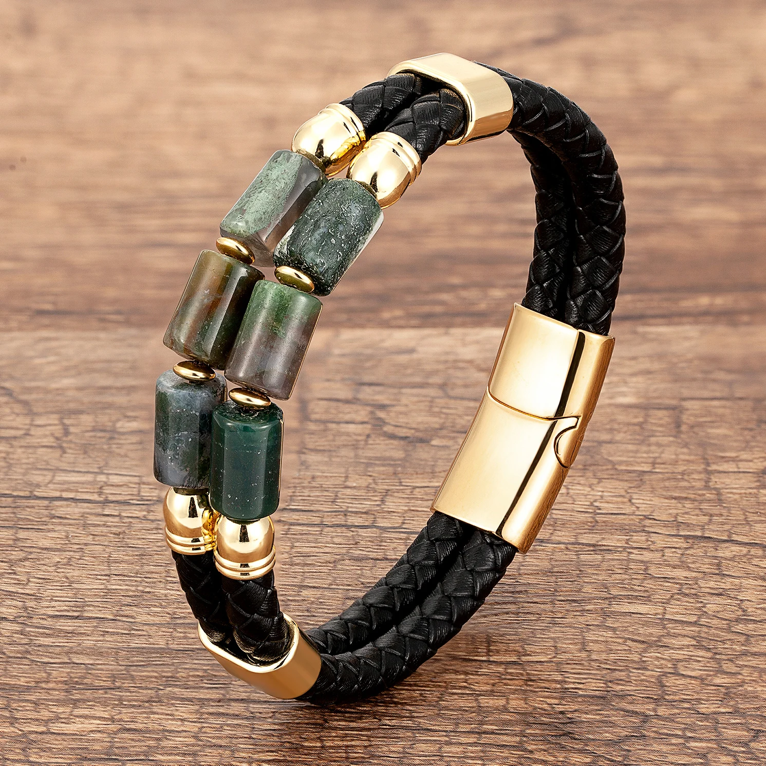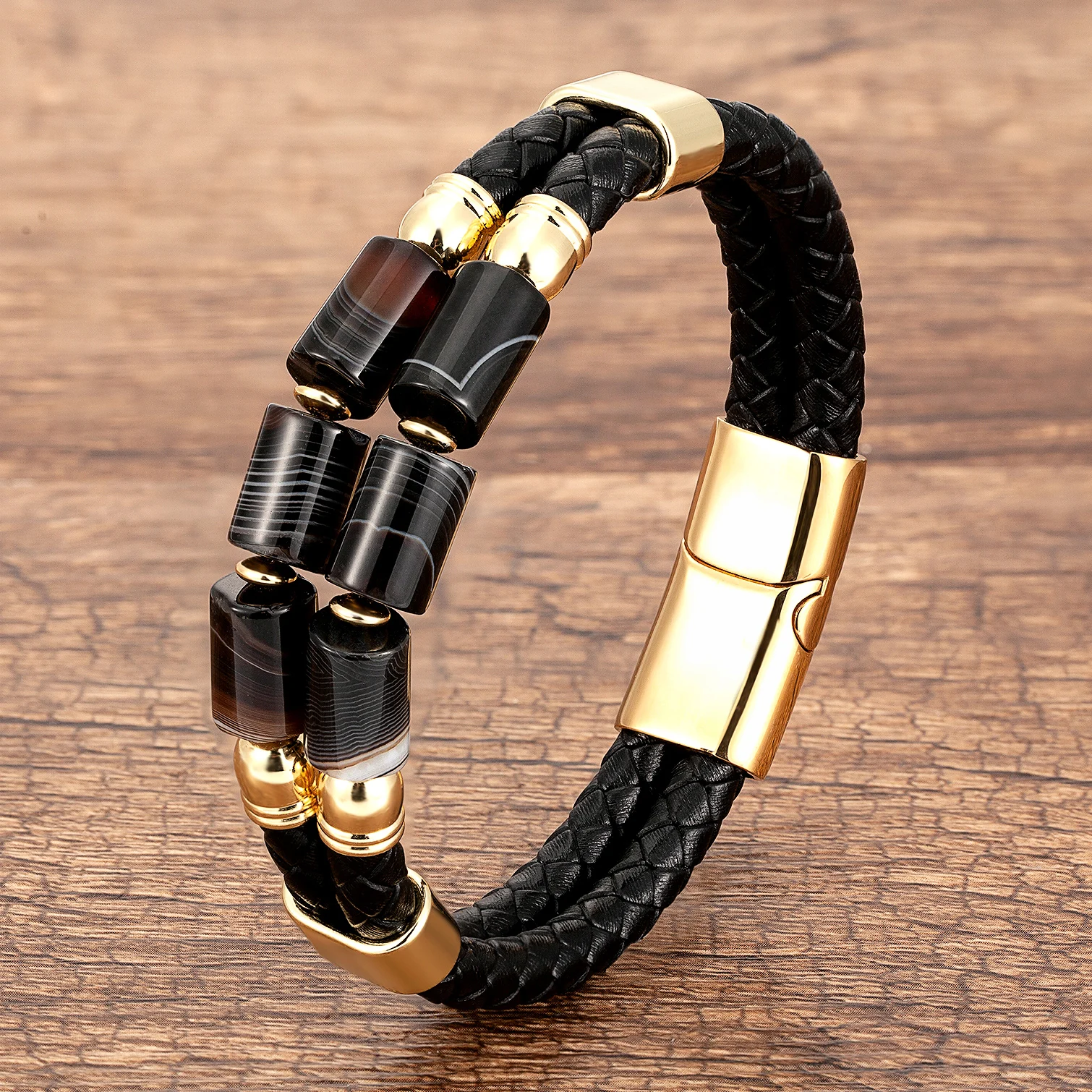 This stylish double stone bracelet combines a luxurious design with natural elements. The double row of natural stone beads adds depth and texture, while the multi-layer leather band creates a modern and bold appearance.
