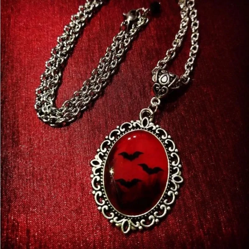 The oval pendant (approx. 25 mm) features a deep blood-red background with an embossed bat design, creating a dramatic vampire-inspired centerpiece. The link chain adds to the vintage feel, making it perfect for Halloween, cosplay, parties, or everyday witchy and Gothic outfits.
