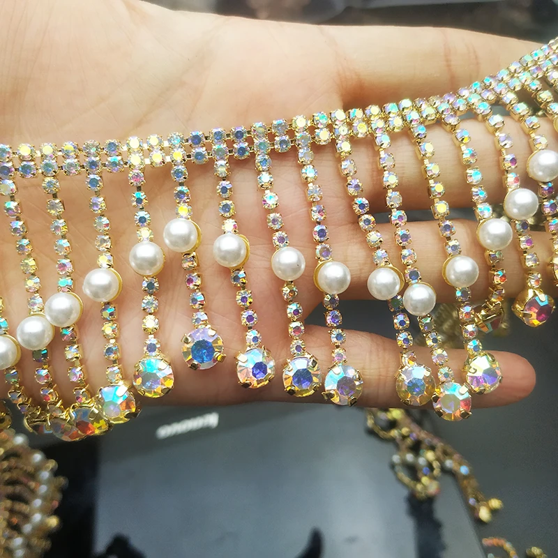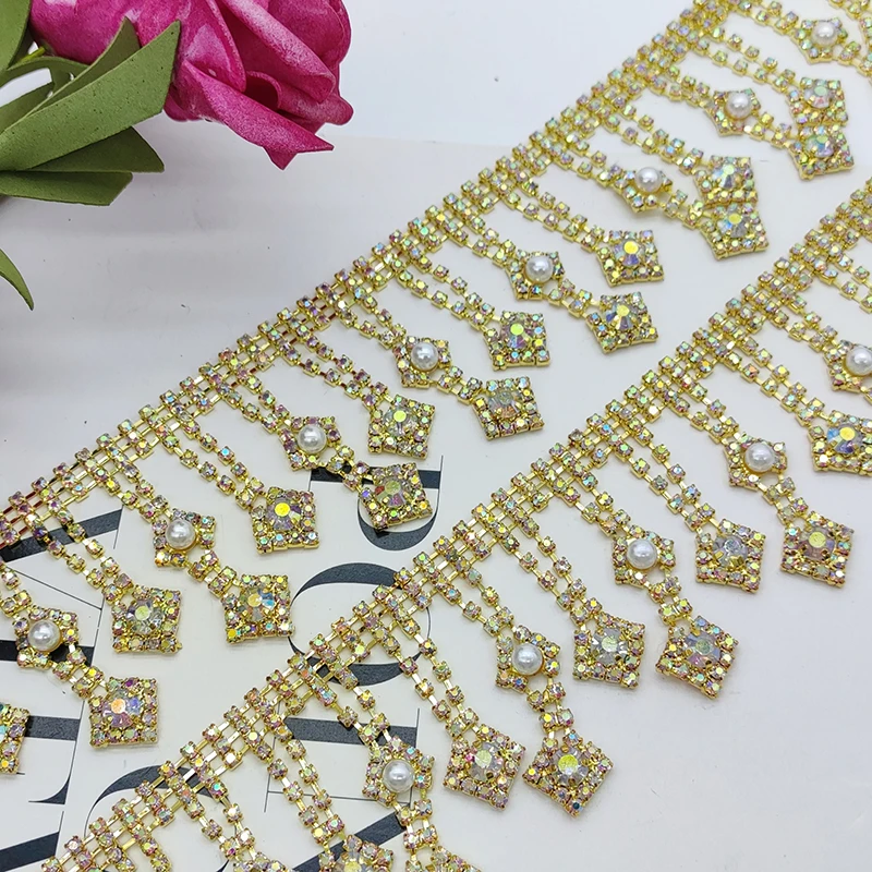 Besetzt mit funkelnden Strasssteinen und Perlen, eignet sich das Band ideal zur Verzierung von Hochzeitskleidern, Abendroben, Taschen oder DIY-Accessoires.