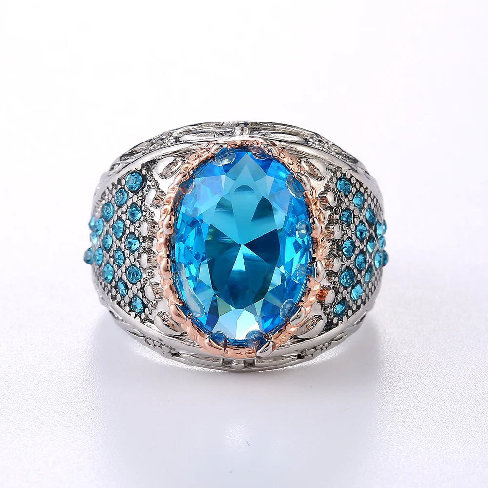 Its large oval-cut sky blue cubic zirconia sparkles brilliantly in the light, set in a refined prong setting for maximum shine.