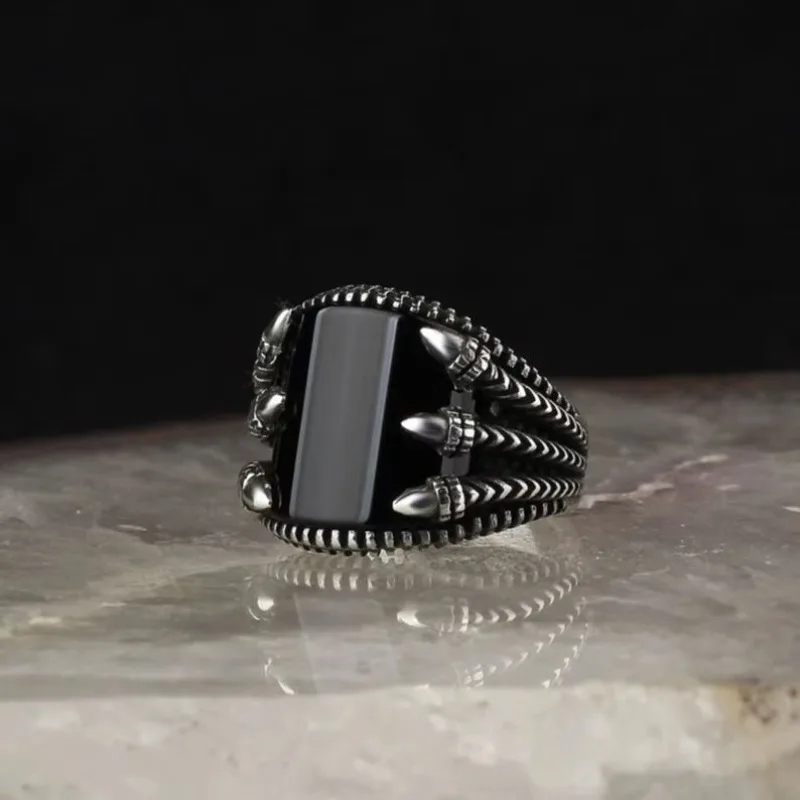 Sein geschwungenes Retro-Muster in Kombination mit dem tiefschwarzen Stein verleiht ihm eine geheimnisvolle, kraftvolle Ausstrahlung – perfekt für den Punk-, Rock- oder Streetstyle-Look.