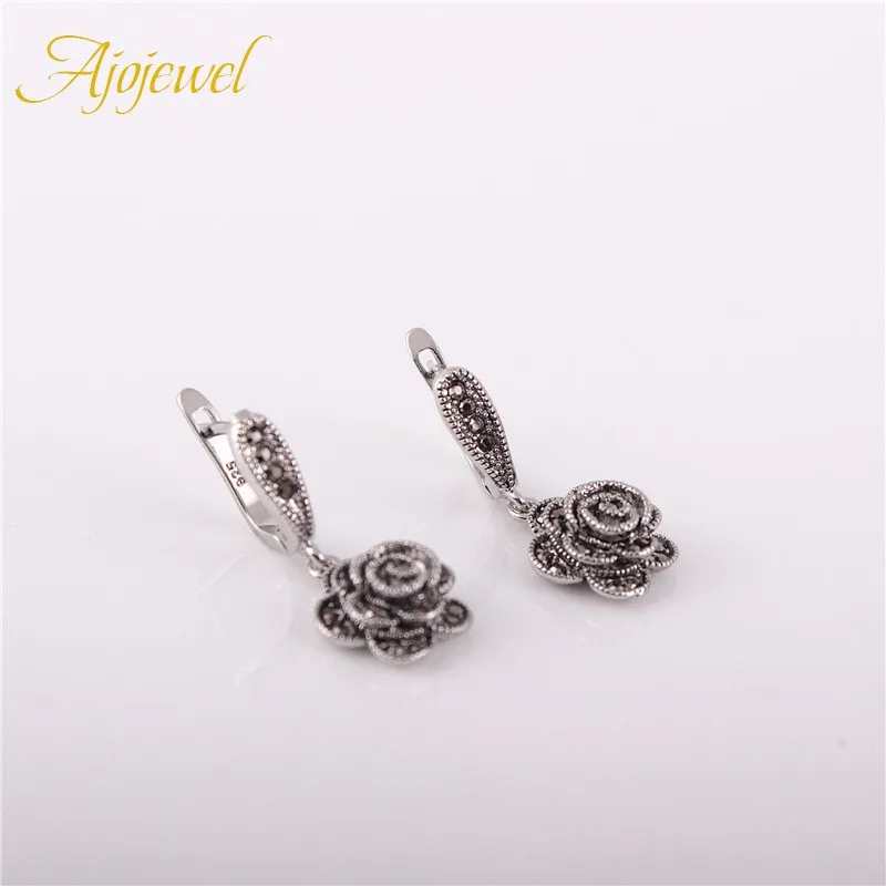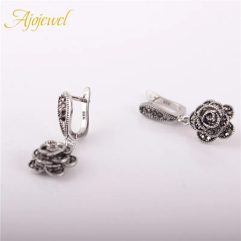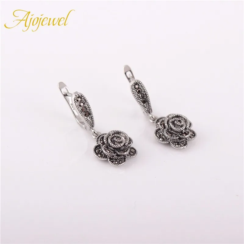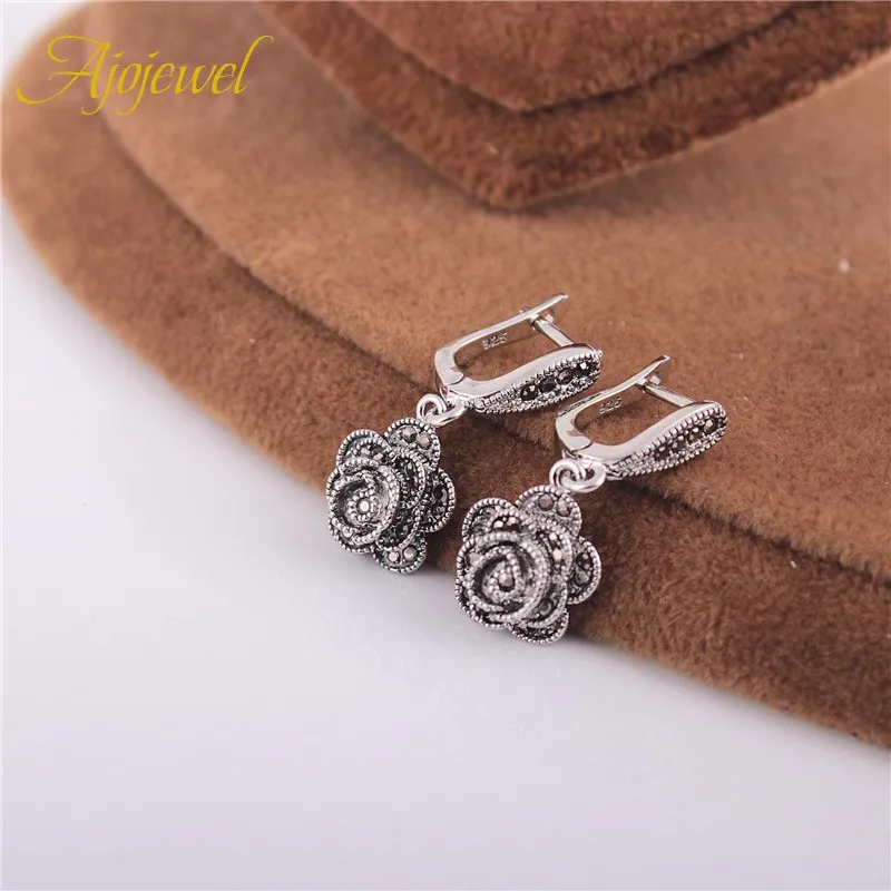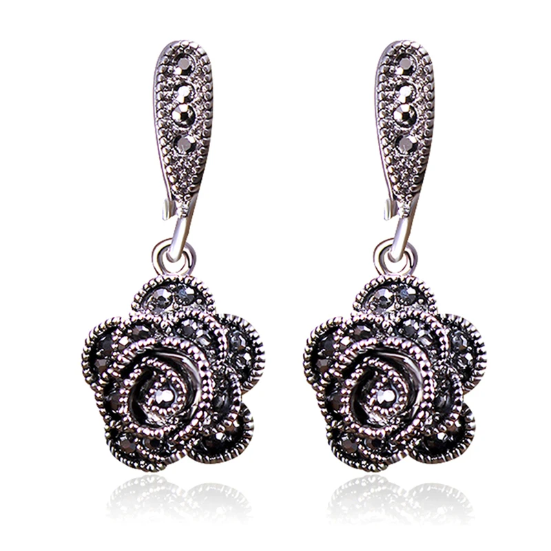 Product Name: Ajojewel Vintage Black CZ Rose Flower Drop Earrings (Silver Color)