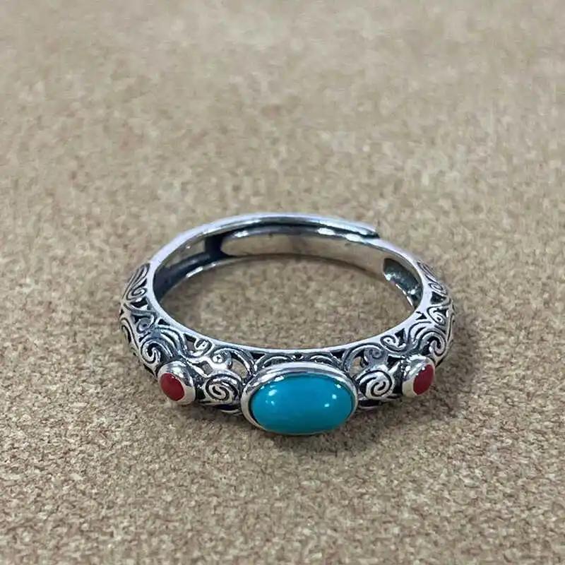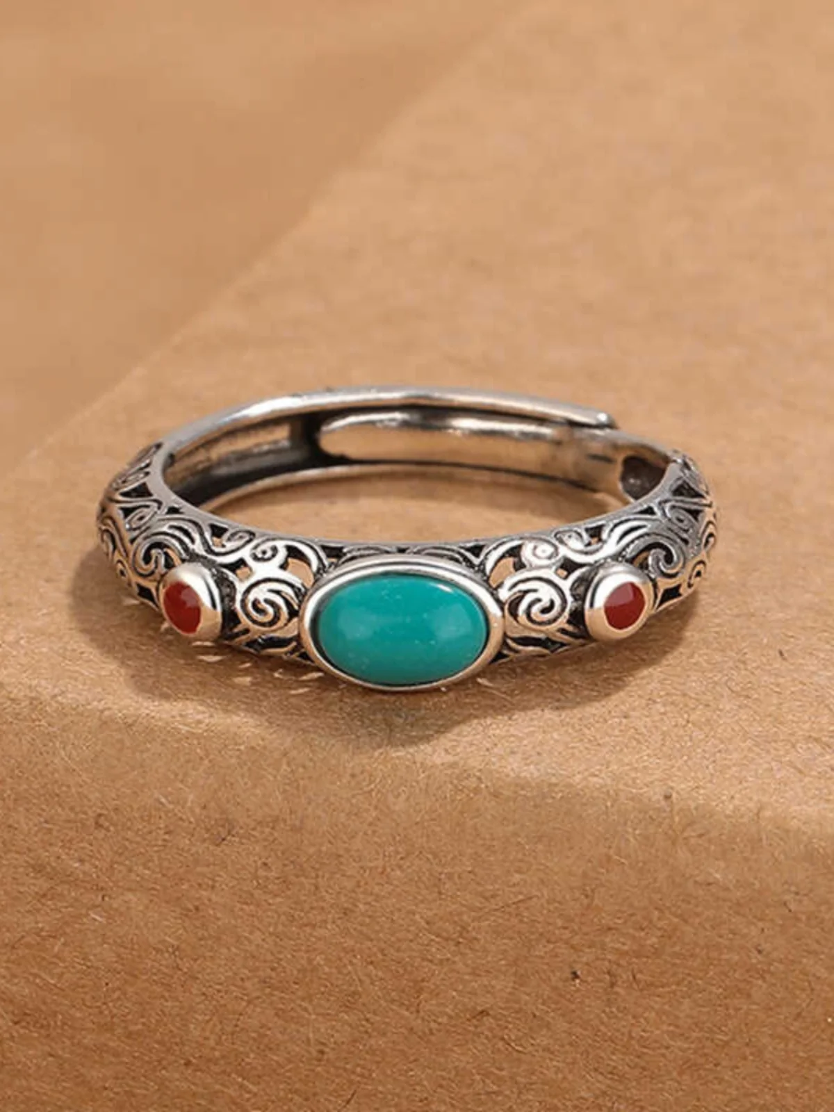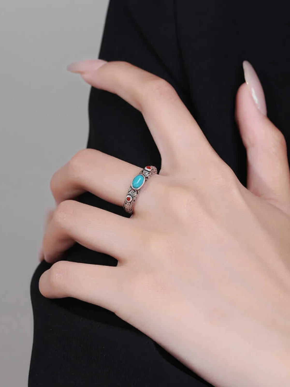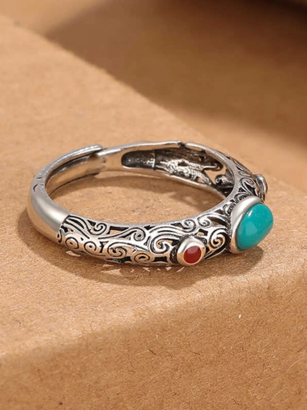 Silberfarbener Vintage Open Ring – Handgefertigter Ethno-Ring mit Türkis & roten Details