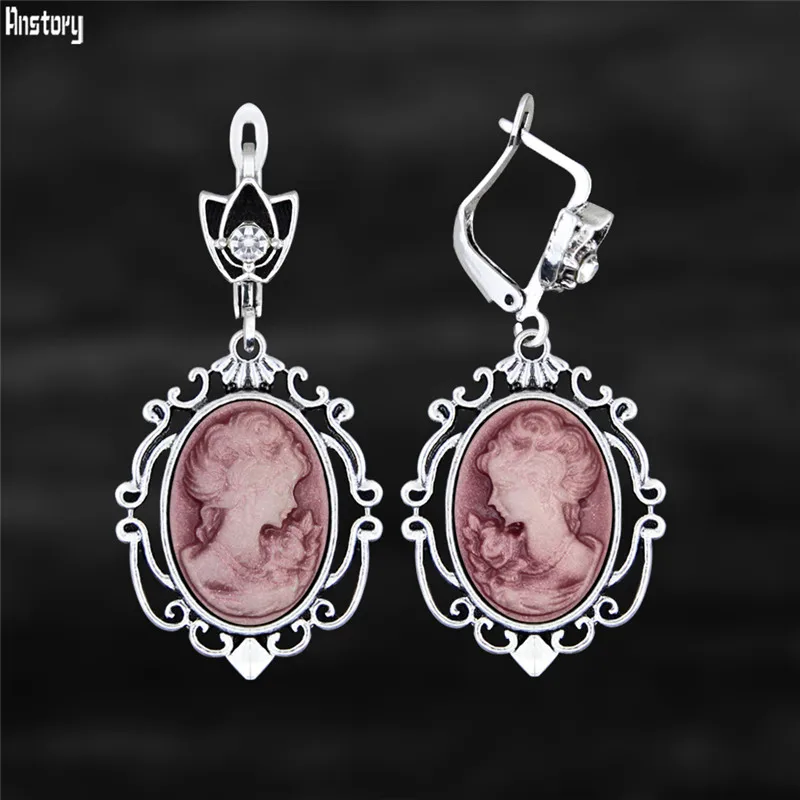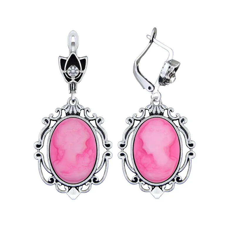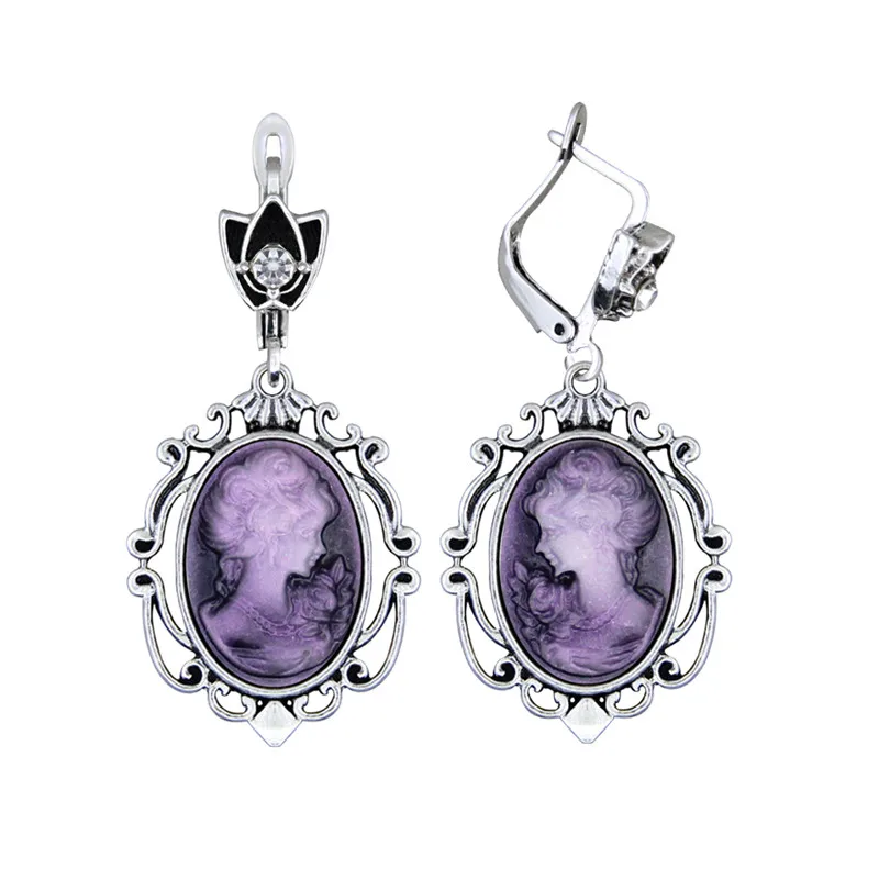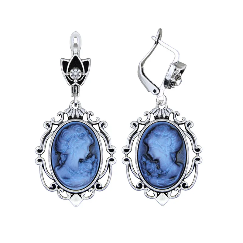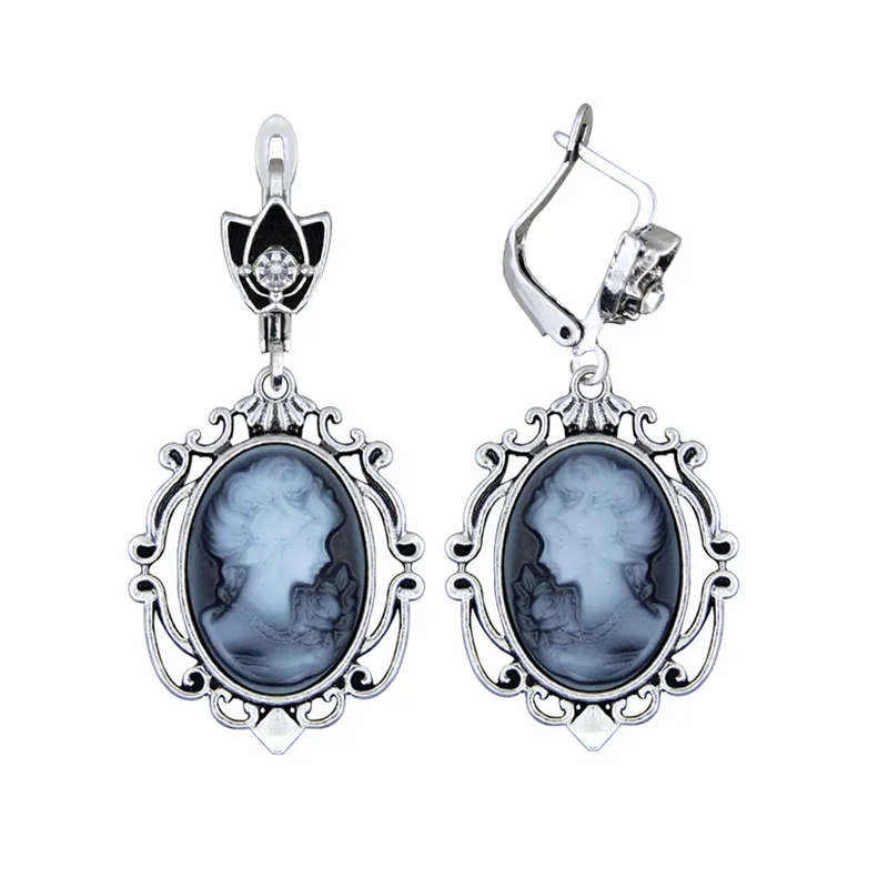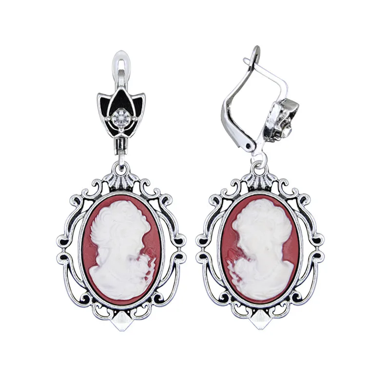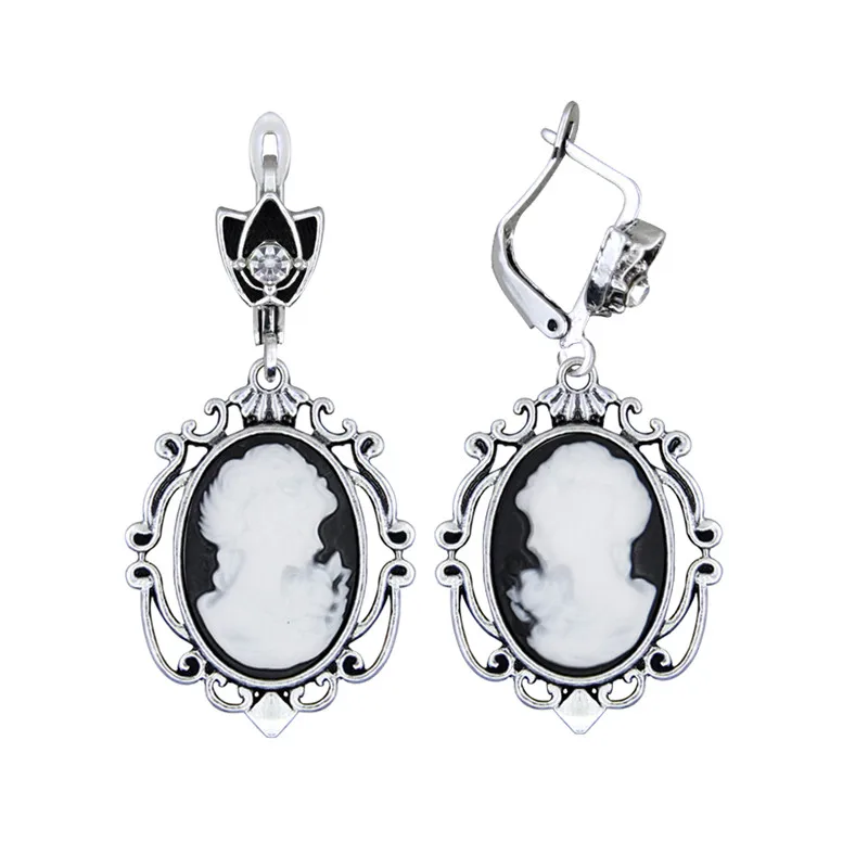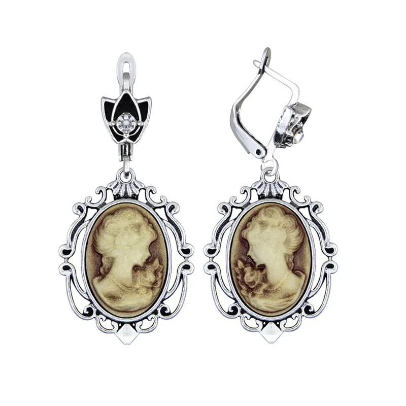 The resin cameo is set in an antique silver-plated setting made from zinc alloy, Tibetan silver, and copper, giving the earrings a timeless, Victorian-inspired look.