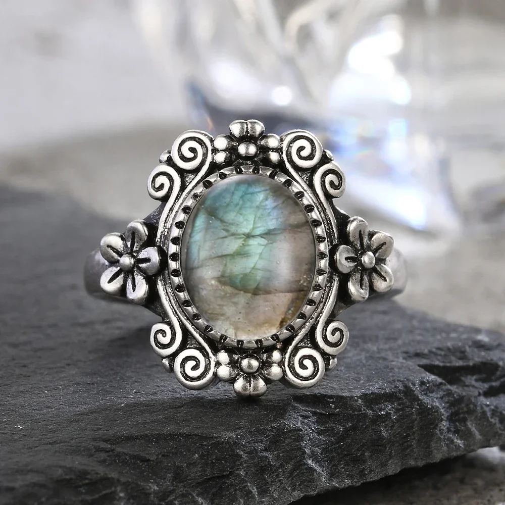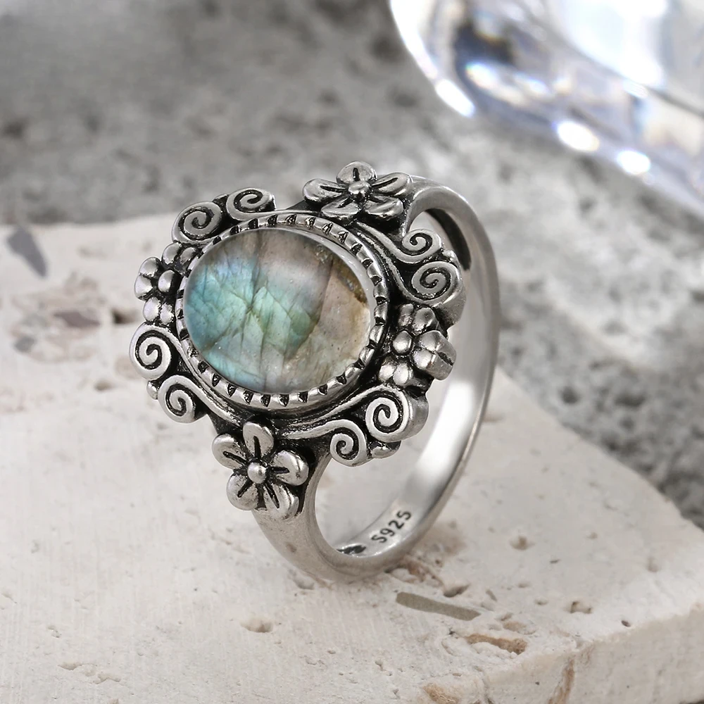 Vintage 925 Sterling Silber Ring mit Ovalem Labradorit & Blumen-Design