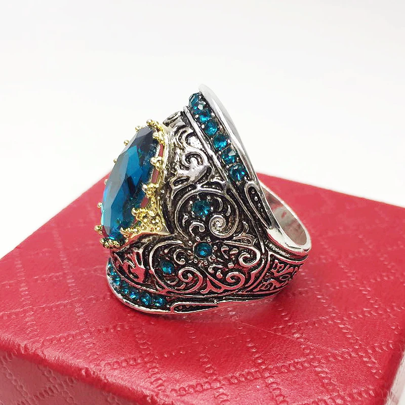 Im Mittelpunkt steht ein tiefblauer Saphir-Edelstein, der von funkelnden Zirkonia-Ornamenten umrahmt wird und dem Ring eine luxuriöse Ausstrahlung verleiht.