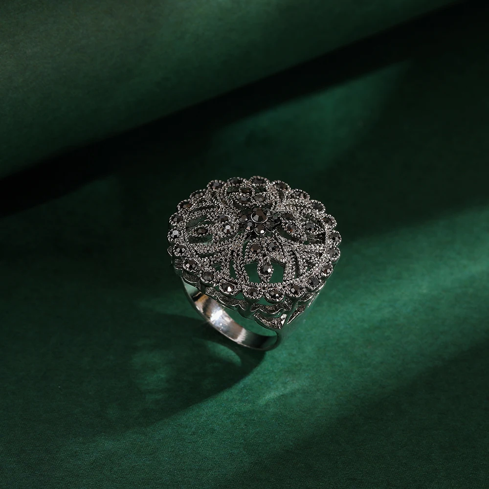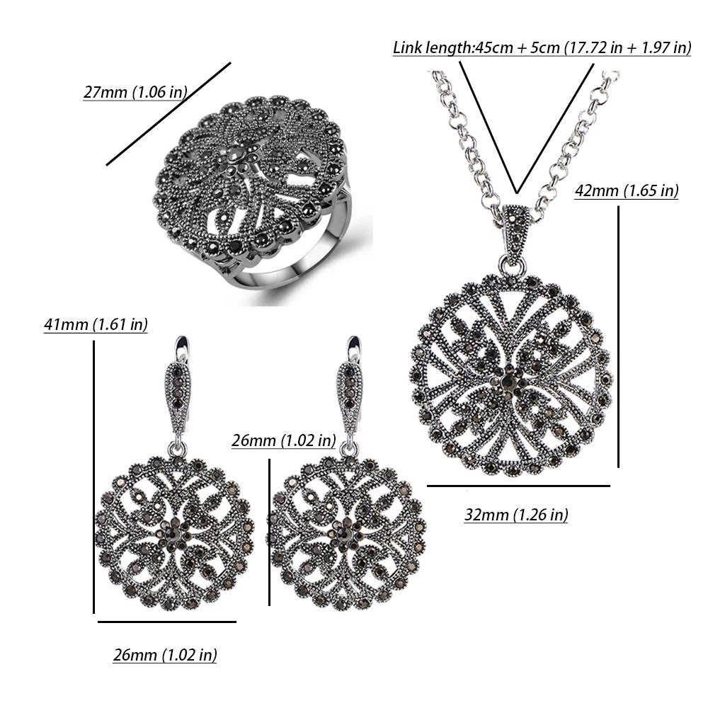 Product Name: Ajojewel Vintage Hollow Flower Jewelry Set (Full Black Rhinestone) – Necklace + Earrings + Ring