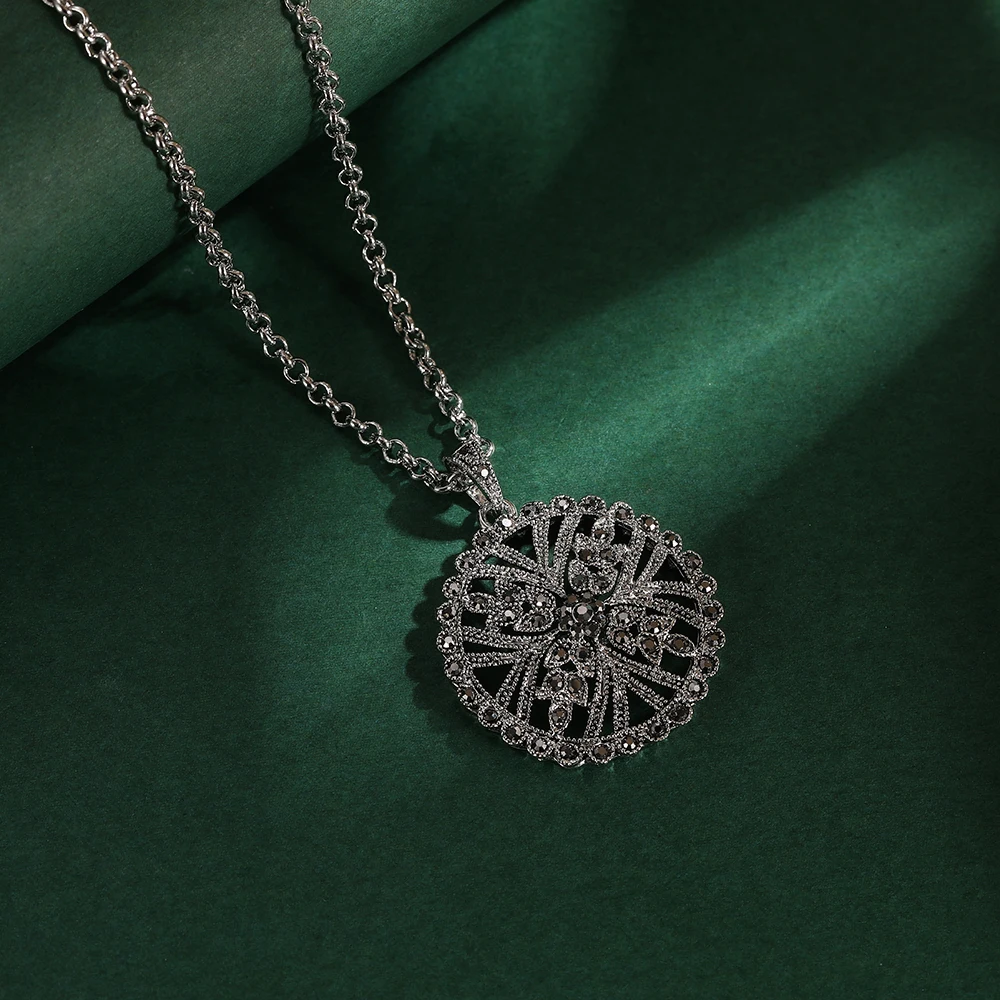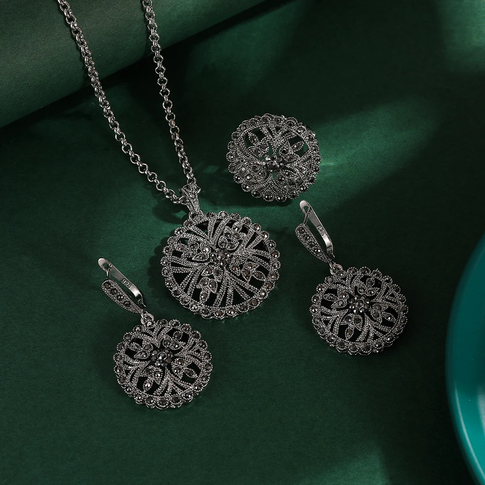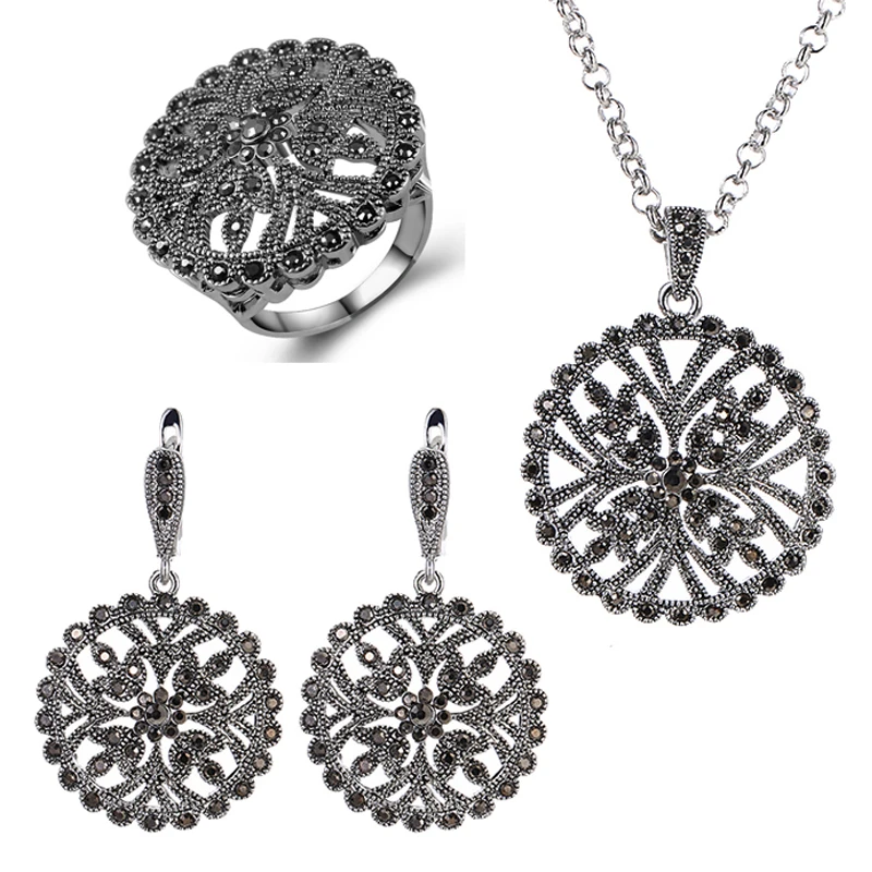 Vintage Hollow Flower Schmuckset – Rundes Set mit Full Black Rhinestones
