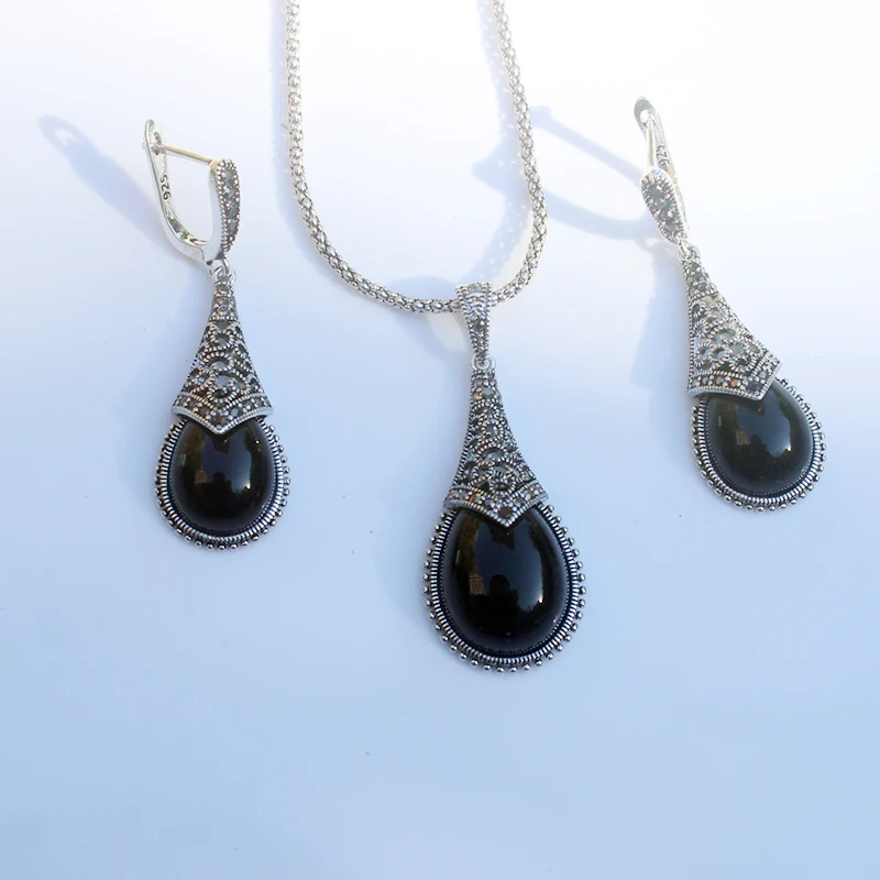 The coordinated set includes a statement necklace and a matching pair of drop earrings, each showcasing a smooth waterdrop-shaped stone framed by a classic silver-color vintage setting with a 925-style look.