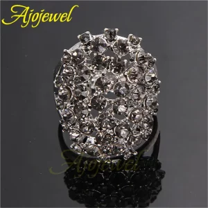 Produktbeschreibung Dieser auffällige Ajojewel Ring ist ein echter Vintage-Statement-Piece:Die komplette Ringfront ist mit grauen Rhinestones besetzt, die in einer geometrischen Anordnung dicht an dicht sitzen und so eine intensive, glamouröse Funkelfläche erzeugen. Mit seiner markanten Breite von ca. 20 mm wirkt der Ring wie ein kleiner Cocktail-Ring im Old-Hollywood-Style. Die Basis aus Zinklegierung ist silberfarben…